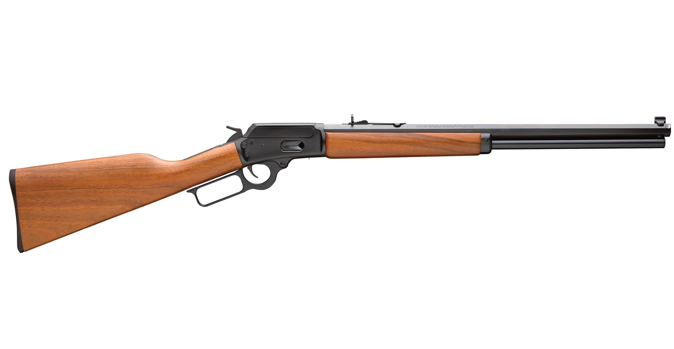 Action: Lever action with squared finger lever; side ejection; deeply blued metal surfaces; solid-top receiver; hammer block safety