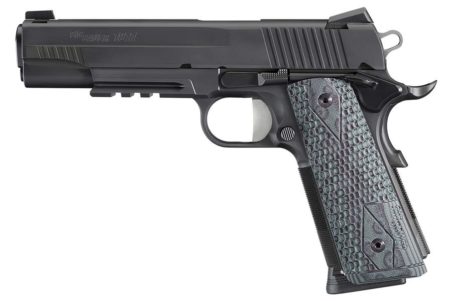 The SIG SAUER® Extreme Series pistols feature a Nitron®-coated machined stainless steel slide and frame. Built standard with low-profile night sights, a built-in accessory rail, front cocking serrations and SAO trigger. Aggressive styling is provided by Hogue® Extreme Series grips. These black and gray G10 grips with integrated magwell, feature Hogue Piranha texture and the SIG SAUER logo.