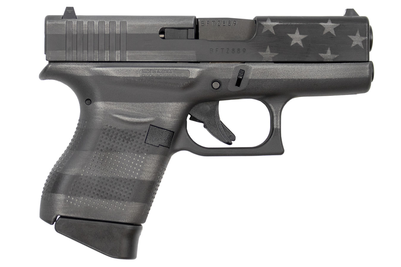 Slide Finish: American Flag Cerakote Brand new 43 9mm Black and Gray Single Stack Pistol with American Flag Slide