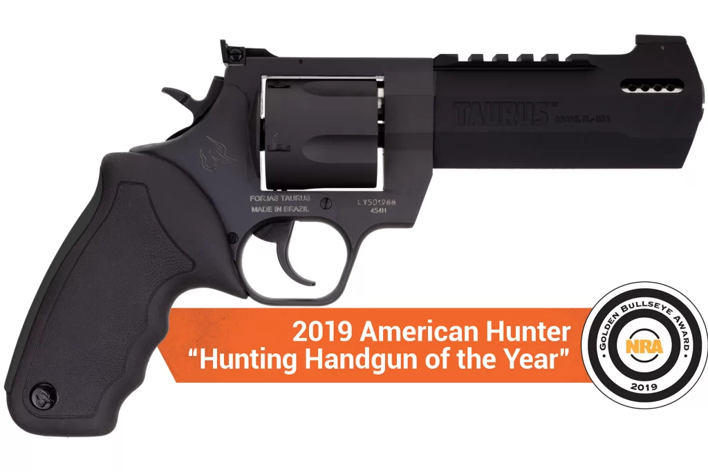 Winner of the 2019 American Hunter Handgun of the Year Golden Bullseye Award, the Taurus Raging Hunter is a next-generation, big-bore revolver that’s first in innovation-and built to last. A fun and effective alternative for short- to medium-range hunting scenarios, this five-shot revolver is chambered in 454 Casull and is available in Matte Black or Two Tone finish. Its revolutionary angular barrel design cuts down on overall weight, while its factory tuned porting and gas expansion chamber reduces muzzle lift for quicker target acquisition. Cushioned insert grips ensure a comfortable, controllable shooting experience.