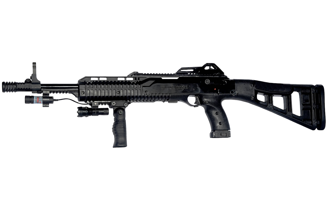 This Hi-Point 45ACP Carbine comes equipped with a forward grip, LAS-40/45 Laser, and a flashlight.