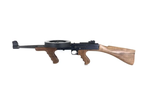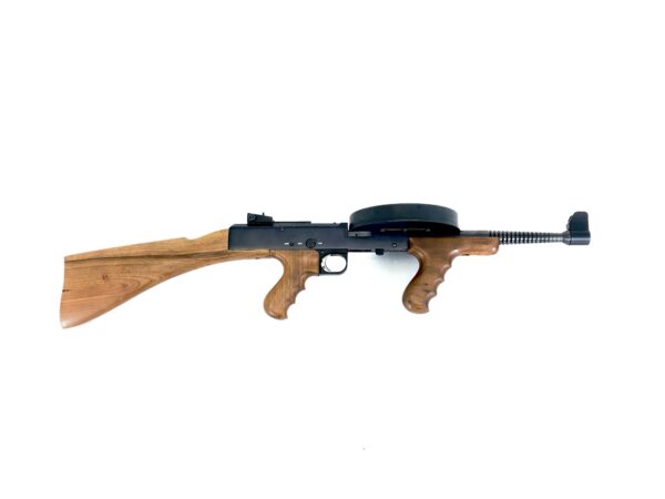 This original factory-made and registered transferable machine gun was built by American Arms International. This particular model is referred to as their “Deluxe” version, noted by the beautiful upgraded walnut hardwood stock, pistol grip, and Thompson-style foregrip, instead of the typically more common Bakelite-style plastic furniture. This model features the 14″ barrel. It will come with its original 177 round metal pan magazine and winder, as well as three additional higher capacity E&L Manufacturing Lexan magazines, two additional magazine winders, magazine loading stand, original manual, and an extra, replacement Bakelite-style stock.
