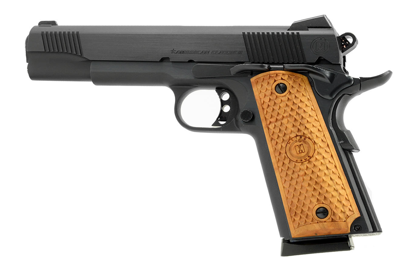 The top-selling 100% mil-spec American Classic 1911 Classic II is a single action pistol with a Novak-style rear sight and a dovetail front sight. It features an extended slide stop, a beavertail grip safety, a combat hammer and trigger, an extended thumb safety, and a forged steel barrel. The grip is constructed of checkered hardwood with diamond cut checkering. This model’s frame and slide has a blued finish.