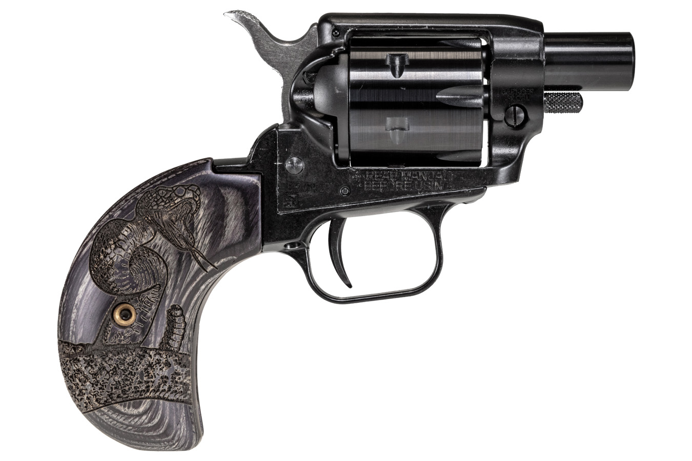 Beyond the barrel length and grip, the Barkeep Boot delivers the familiar operation and quality construction of the Rough Rider series single-action revolvers on which it is based. This includes a hammer firing system, manual safety, classical notched rear sight, and black oxide barrel, frame, and cylinder finish. This model is offered with custom wood burnt snake grips. All revolvers come with a custom Heritage wood-handled ejector rod for removing empty cartridge cases.
