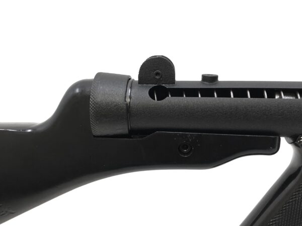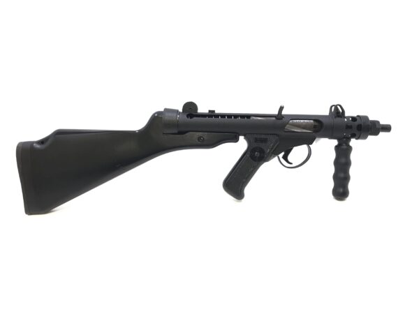 This sub machine gun is in excellent condition, both mechanically and cosmetically, with only some very minor surface wear marks in the finish noted at the rough angle points and around the magazine well. There are no major dings, dents, etc. of any kind noted. The crinkle finish is in excellent condition. The stock and foregrip are also in excellent condition, with no cracks, seams, etc. The middle right side of the stock notes a small indentation, but does not have any chipping, peeling, etc. of the gloss finish (see photos). Mechanically, this gun is in superb condition, as well, with only very minor and limited wear noted on the internals.