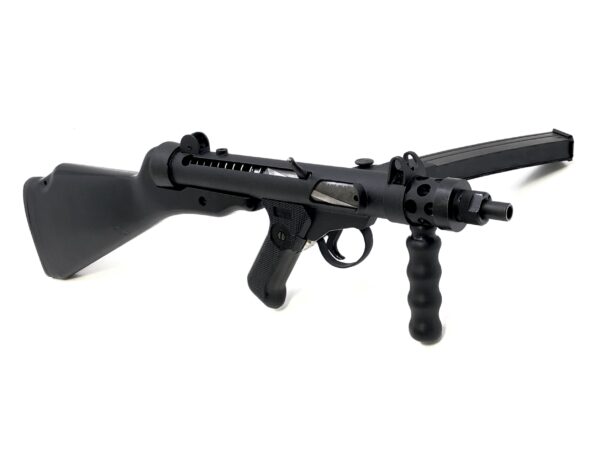 This rare configuration of a Sterling sub machine gun was meticulously created with a DLO Mfg. MK2 registered receiver tube and original British parts kits. Originally intended for commando, tanker, and plain clothes operators, this model features the Mk 7’s 4″ compact barrel design, and comes with an original, hard-to-find removable solid stock and vertical foregrip. The removable stock allows this system to be utilized in either a machine pistol configuration or as a shoulder-fired sub machine gun platform. This model also comes with an original 34rd magazine.