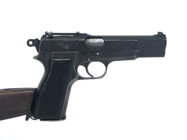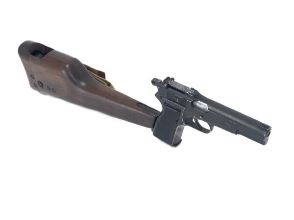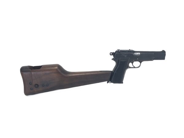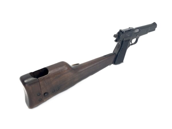 Once of only a few known examples on the NFA registry, this model was a Form 2 Registration by Hard Times Armory (which reportedly registered less than five examples). Originally made by Canadian arms maker John Inglis (with official licensing by FN) to help fulfill the various military contracts that were awarded by FN during World War II, this model was originally part of Inglis’s Chinese contract version, as it features a tangent rear sight and was designed to use a wooden holster that could be attached to the rear of the pistol and used as a shoulder stock. The Chinese had specifically requested this design change and adaptation, as they where looking for something to replace the Mauser C96 “broom handle” pistols that were popular there, and also utilized a removable wooden stock/holster.