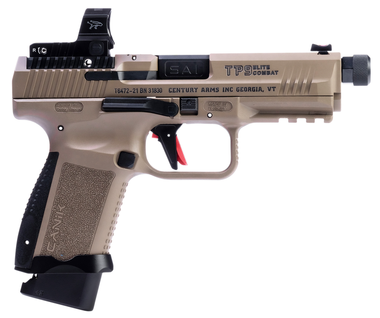 The Canik TP9 Elite Combat comes with an optics-ready slide, an Enhanced Trigger, advanced coatings on all steel and internal parts, ships with two magazines (one with an aluminum +3 extension), plus a retention holster. Every Elite Combat comes standard with performance upgrades by Salient Arms International. The TP9 Elite Combat represents a whole new generation of Canik handguns. The custom features on the TP9 Combat Elite designed by Salient Arms include- Proprietary Convex Thread Protector with 1/2×28 right hand threads, aluminum speed funnel magazine well. New custom Canik features include aluminum Plus 3 magazine extension, small parts and internal components nitride or high-wear nickel-coated, flat-face aluminum trigger with 4.8 lb trigger pull weight, slide, barrel and small steel parts nitride-coated (slide is then coated with FDE Cerakote), optics-ready slide with one adapter plate and charging handle. Includes Retention Holster with Slide Lock Release and two magazines.