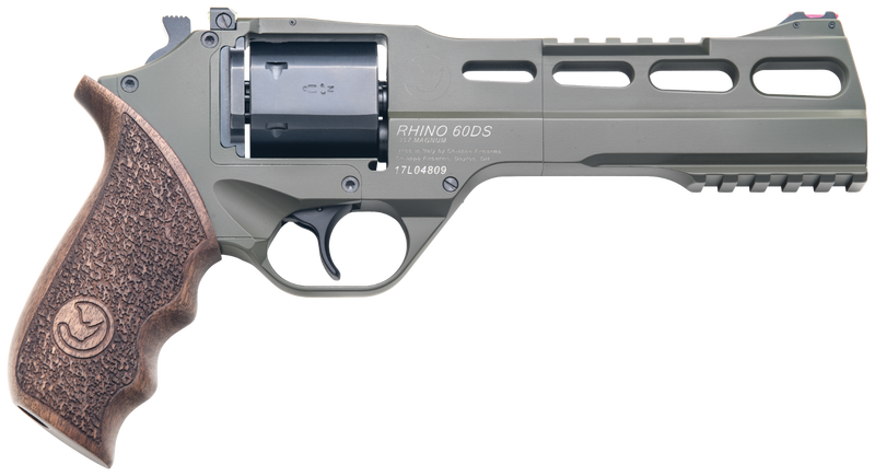 The Chiappa Rhino is the most innovative development in revolver technology in decades. The Rhino 60DS fires from the bottom of the cylinder rather than the top which dramatically reduces muzzle rise and recoil felt by lowering the axis of the bore almost to the palm of the shooters hand. An aluminum alloy frame and barrel shroud makes the Rhino lightweight and easy to carry. The snag resistant “hammer” is actually a cocking device because of the Rhino’s innovative completely enclosed firing mechanism which can be fired either single or double action. A cocked indicator is clearly visible to indicate the internal hammer status. Another innovation is the hexagonal cylinder which keeps the revolver’s width to a minimum. Included is a fiber optic front sight. This Chiappa Rhino 60DS model features a 6″ barrel with rails on top and bottom, OD green frame and barrel with a black cylinder.