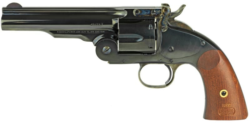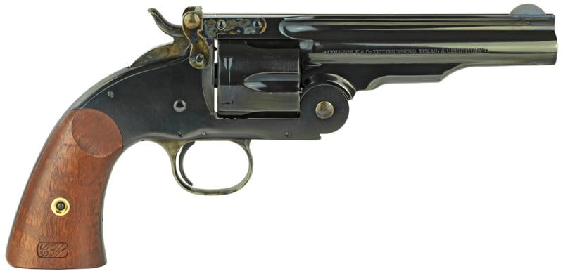 Cimarron offers the Model No 3 Schofield, 2nd Model, copied directly from an original in our vast collection of antique firearms. The Cimarron Model 3 Schofield is available in 3 1/2 inches in .45 Colt, 5 inches in .38 Special or .45 Colt, or the cavalry length 7-inch barrel in .38 SP, .44-40 or .45 Colt. (45 Colt chambered Cimarron Schofields also handle the .45 Schofield cartridge). Whether you are into the real Old West, or the “reel” West where hombres like the Schofield Kid from Clint Eastwood’s Unforgiven, or gunman Charlie Prince from Russell Crowe’s 3:10 To Yuma, packed these top-break sixguns, you’ll enjoy owning a Cimarron Schofield!