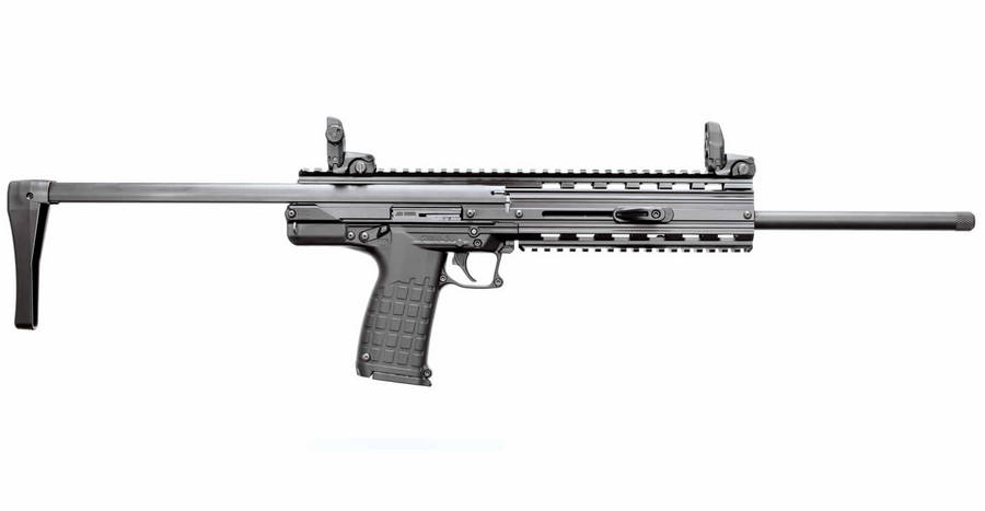 The Kel-Tec CMR-30 Rifle is chambered for the .22WMR cartridge (22 Magnum). The design is a rifle version of the popular Kel-Tec PMR-30 pistol. The same 30 round magazines are used. The single action trigger mechanism, bolt stop, ambidextrous safety levers, and mag catch are also identical. The CMR-30 rifle includes a collapsible stock and the 16” barrel is threaded 1/2”-28 to accept many different muzzle attachments. The multi-position collapsible stock allows for a short overall length of 22.7” with the stock collapsed, and 30.6” when extended. The long top picatinny rail will accept a multitude of different optics, and the removable under picatinny rail is included. The ambidextrous operating handles are non-reciprocating and latch in the forward position. The stock latch lever is also ambidextrous and located just in front of the trigger guard. An integral sling loop is included near the rear of the grip, on both sides.