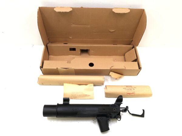 The launcher comes with its original box and packaging, mounting clamp and heat shield assembly, M16 hand guard, and sight.