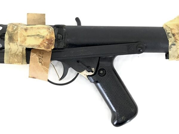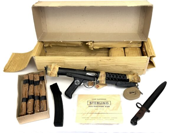 This amazing condition machine gun still has the original oil tape packing that was applied to the sharp edges in the factory in England. The exterior condition has been well-oiled and well preserved over its lifetime. We have carefully peeked under the protective wrap to ensure the original matte black crinkle finish is, in-fact, intact, which it appears to be perfectly preserved. It comes in its original shipping box with its serial number hand-written on the side of the box by the Sterling factory. The serial number is a “KR” prefix, indicating it was made by Sterling for commercial export. In the box, this weapon also includes its original bayonet, sling, and factory manual, as well as five 34rd original magazines (one of which has been unwrapped to ensure preservation). This weapon is in unbelievable condition for a gun that pre-dates the 1968 import cut-off to the US! There may not be another one left like it anywhere in the world!