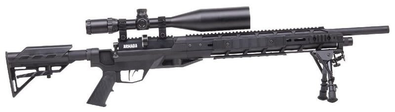 The Crosman Armada is built in America and delivers velocities of 900 FPS with 50 foot pounds of energy, making it an ideal predator and small game rifle. It includes an 8-shot magazine, full suppression and gets up to 16 shots per fill. The receiver features a machined Picatinny rail and the bolt is reversible for left-handed shooters. An on-board gauge for monitoring air pressure and a crisp two-stage trigger make this a worthy addition to your gun collection.