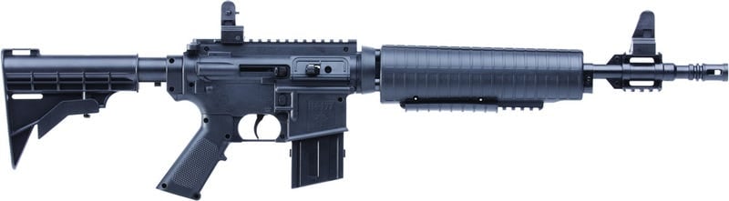 The next great variable pump rifle is here! If you enjoy the adaptability of the AR platform then you’re going to love the M4-177. The airgun features a rifled steel barrel and shoots both pellets and BBs. The rifle’s variable pump action is easy to use for right or left-handed shooters.Expect velocities up to 660 fps with BBs and 625 fps with 7.9gr, .177iber pellets. There’s plenty of picatinny rails for mounting your favorite accessories, plus the front and rear sights and stock are removable for the ultimate in upgrade possibilities. Features include: Includes a Firepow’r 5-shot pellet clip, Reservoir capacity of 350 BBs, Adjustable stock to fit every shooter, Loop slots for adding a gun sling,Windage and elevation adjustments, Two aperture sizes instantly available on rear sight: just flip up the small one for stationary or bullseye targets or the large one for moving or large targets, Removable magazine stores pellet clip and sight adjustment tool.