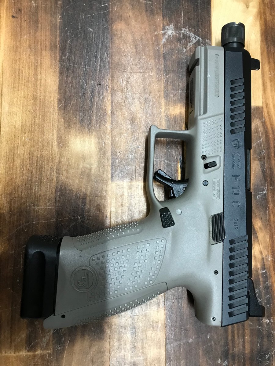 This used CZ P-10 C 9mm Luger Pistol features a CZ grip angle, mild palm swell and deep beavertail. The pistol is built for durability as well with its fiber-reinforced polymer frame and nitride finish. The swappable magazine release is left-hand friendly.