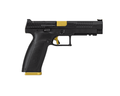 The new P-10 F Competition-Ready utilizes the full-size P-10 F frame and has a barrel and slide that are a half-inch longer, providing a longer sight radius for the included fiber optic front sight and fixed serrated rear sight. The P-10F is chambered in 9mm and is equipped with a 5 inch barrel, optics ready slide, an HB Industries Theta trigger kit that drops the pull weight as low as 4.25 lbs., and three 19 round magazines. Get the best deals on the CZ P-10 F Competition and other competition pistols online from GrabAGun today!CZ P-10 F Competition Features While many of CZ’s tactical handguns were born of competition guns, the new CZ P-10 F Competition-Ready pistol followed the opposite trajectory. The new P-10 F Competition-Ready utilizes the full-size P-10 F frame and has a barrel and slide that are a half-inch longer, providing a longer sight radius for the included fiber optic front sight and fixed serrated rear sight. Additionally, like other P-10 models, the slide is milled to accept mounting plates for the most popular micro red-dot optics on the market. The pistol is outfitted with an Apex Tactical extended magazine catch, extended slide stop, back slide cover along with a HB Industries trigger for increased performance. Since every competition gun needs a little flash, gold accents on the barrel slide cover and on the trigger and three magazines equipped with aluminum Henning Group bases make this handgun stand out in the P-10 line and on the firing line. CZ P-10 F Competition Specifications Brand: CZ-USA Model: P-10 F Competition-Ready Caliber: 9mm Luger Capacity: 19+1 Action: Striker Fire Frame Finish: Black OAL: 8.50″ Frame Material: Polymer Hand: Ambidextrous Slide Finish: Black with Gold Accent Slide Material: Steel Slide Description: Inside Railed Black Steel with Optic Cut & Gold Accent Grips: Black Polymer Sight Configuration: Fiber Optic Front Safety: Firing Pin, Trigger Barrel Description: 5″ Cold Hammer Forged