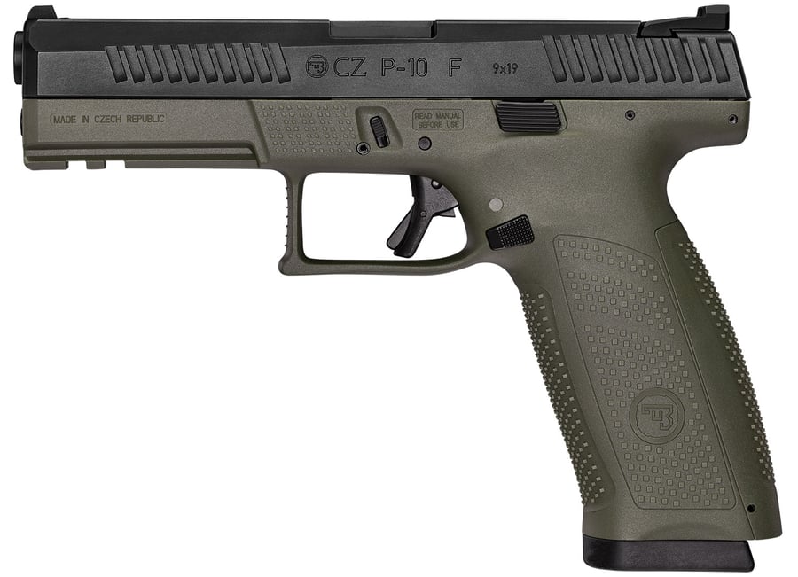 With CZ reliability engineered ergonomics and a bevy of features both familiar and new the P-10F is the complete package. The CZ grip angle helps the P-10F avoids that ‘brick-in-the-hand’ feeling that has plagued many in the striker-fired genre allowing it to point naturally. A mild palm swell deep beavertail and three interchangeable backstraps make the P-10F fit a wide variety of hands. The P-10F’s trigger is designed to minimize creep and stacking and after initial break-in averages a clean 4.5-5 lb. pull and rebounds with a short positive reset – meaning single shots can be meticulously placed while follow-ups are effortless. Built to withstand the rigors of military use its fiber-reinforced polymer frame and hardy nitride finish are made for the daily grind. A generous trigger guard allows use with gloved hands while being undercut to allow as high a grip as possible and a set of metal tactical sights allow for one-handed manipulation of the slide on a belt. Like all CZ pistols the P-10F is built with CZ’s legendary cold hammer forged barrel. FEATURES: Cold Hammer Forged Barrel; Ergonomic Grip and Controls; Trigger Safety; Fiber-Reinforced Polymer Frame FINISH: BLACK AND OD GREEN CERAKOTE FINISH