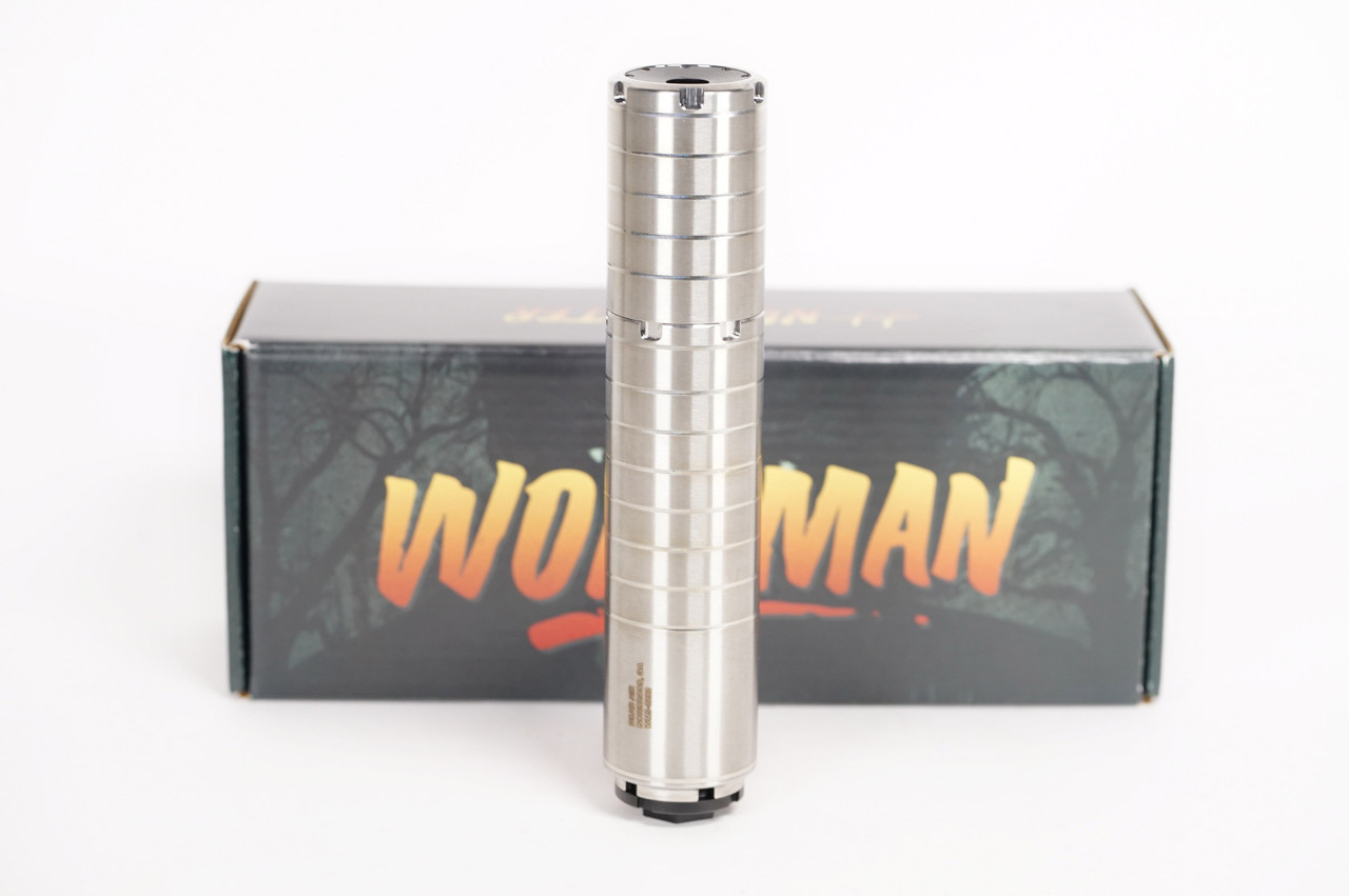 The Wolfman has been touted for its impressive performance using high rates of fire. Featuring a wipe compatible front cap (which is included), wipes can be replaced by the user with commonly available washer sizes. Dead Air constructed the Wolfman to boast a large internal volume and generous blast chamber which yields maximum suppression at both the muzzle and the ear.