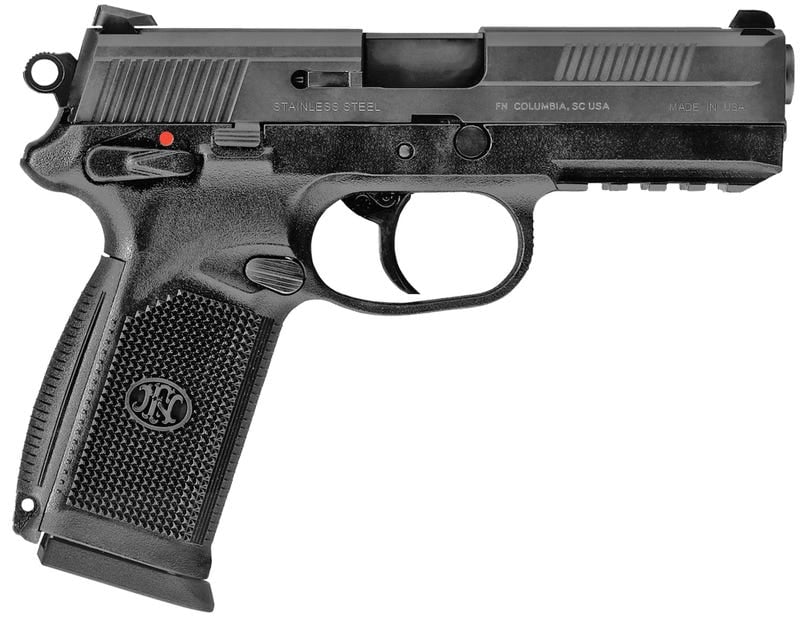 Ambidextrous operating controls (decocking/safety lever, slide stop, and magazine release) make the FNX perfect for competition or personal defense. This FN ships with two (2) magazines and a lockable hard case. Made in the USA. This 45 ACP model has a black frame and slide with a 15+1 capacity.