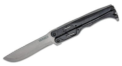 Small enough to stow away in your backpack or strapped to your body for quick access, the Gerber DoubleDown Folding Machete knife is an awesome everyday tool for work, hunting, or the unexpected. The blade exhibits extreme toughness and excellent edge retaining capabilities. Featuring a 6.75″ 420HC Stonewashed Recurve Blade the Gerber DoubleDown Folding Machete is a great tool that you should never leave home without.Gerber DoubleDown Folding Machete 6.75″ 420HC Stonewashed Recurve Blade Black Handles QuadLock Features: The American-made DoubleDown Folding Machete is an outdoor tool that delivers never-before-seen function with an innovative design. Folding up to half its size, the DoubleDown can easily stow in a pack, on a belt, or attached to MOLLE gear. The unique design allows the user three distinct functions in one compact package: chop, cut, and baton. A patent-pending QuadLock system engages in three positions to ensure safe operation under varying levels of stress. Gerber DoubleDown Folding Machete 6.75″ 420HC Stonewashed Recurve Blade Black Handles QuadLock Specifications: 420HC recurve blade QuadLock locking system Two handling positions Baton jimping Stability bar Overstrike guard MOLLE or belt-carry sheath Blade Length: 6.75″ Overall Length: 15.1″ Blade Material: 420HC Stainless Steel Blade Style: Recurve Drop Point Blade Finish: Stonewash Handle Color: Black Locking Mechanism: QuadLock Weight: 18 oz. Made in the USA