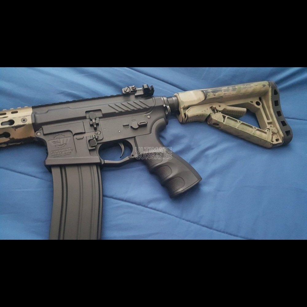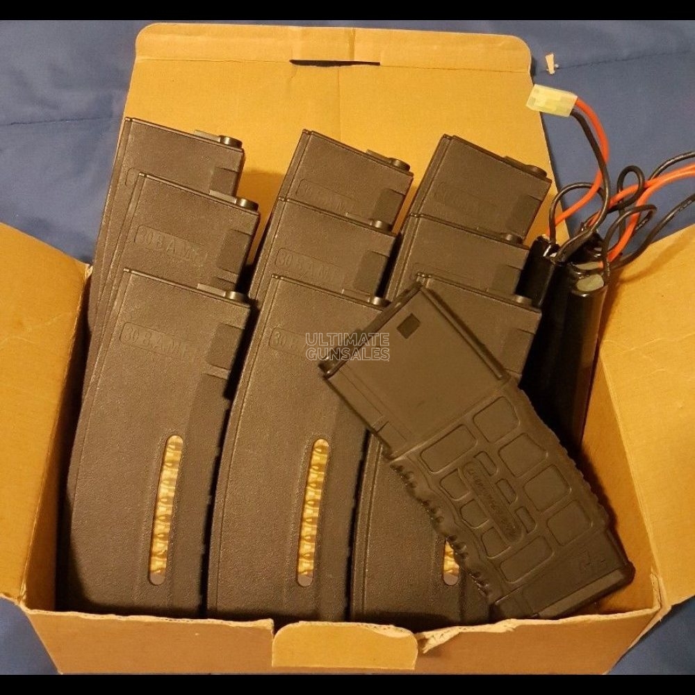 Painted G&G SRXL – Tight Bore Inner Barrel (Angel Custom) Recommend a higher quality barrel – Tokyo Marui Air Nozzle and Nub – Prometheus Hop up Rubber – Mosfet – 3 Round Burst Capable – Included Front Grip Bundle also includes: 9 Evike BAMF Mid Cap Magazines and the G&G High Cap Magazine which came with the rifle. 3 Elite Force 9.6 1600 mAH NI-MH batteries
