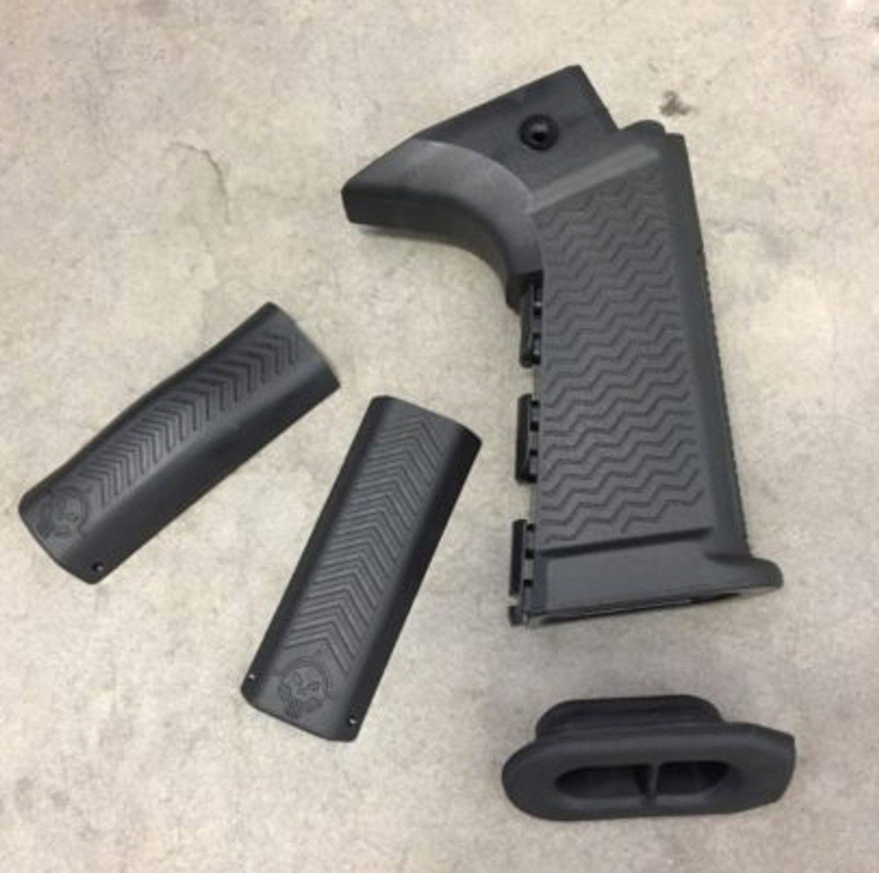 Replacement pistol grip for the CZ Scorpion designed by Yeti Wurks (Gen 3). This grip is injection molded polymer and features a more vertical angle over the factory grip, allowing the user to tuck their elbow in for a more compact stance when operating the weapon. The aggressive texturing and two interchangeable backstraps (large and small) allow the user to dial in the ergonomics even further. Grips are hollow and come complete with a base plug that allows the grip body itself to be utilized as a storage compartment.