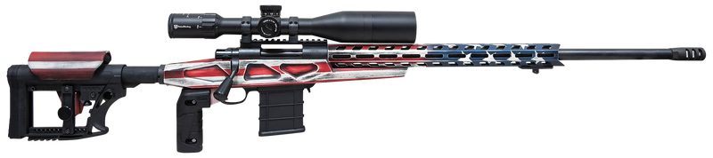 Comfort and functionality are intertwined with its aluminum chassis and the inclusion of the Buffalo River Bipod. The threaded barrel allows for the attachment of various muzzle devices, catering to the shooter’s preference. With its iconic American Flag Cerakote finish, this rifle is not only a tool of precision but also a piece of art, embodying the spirit of the nation.