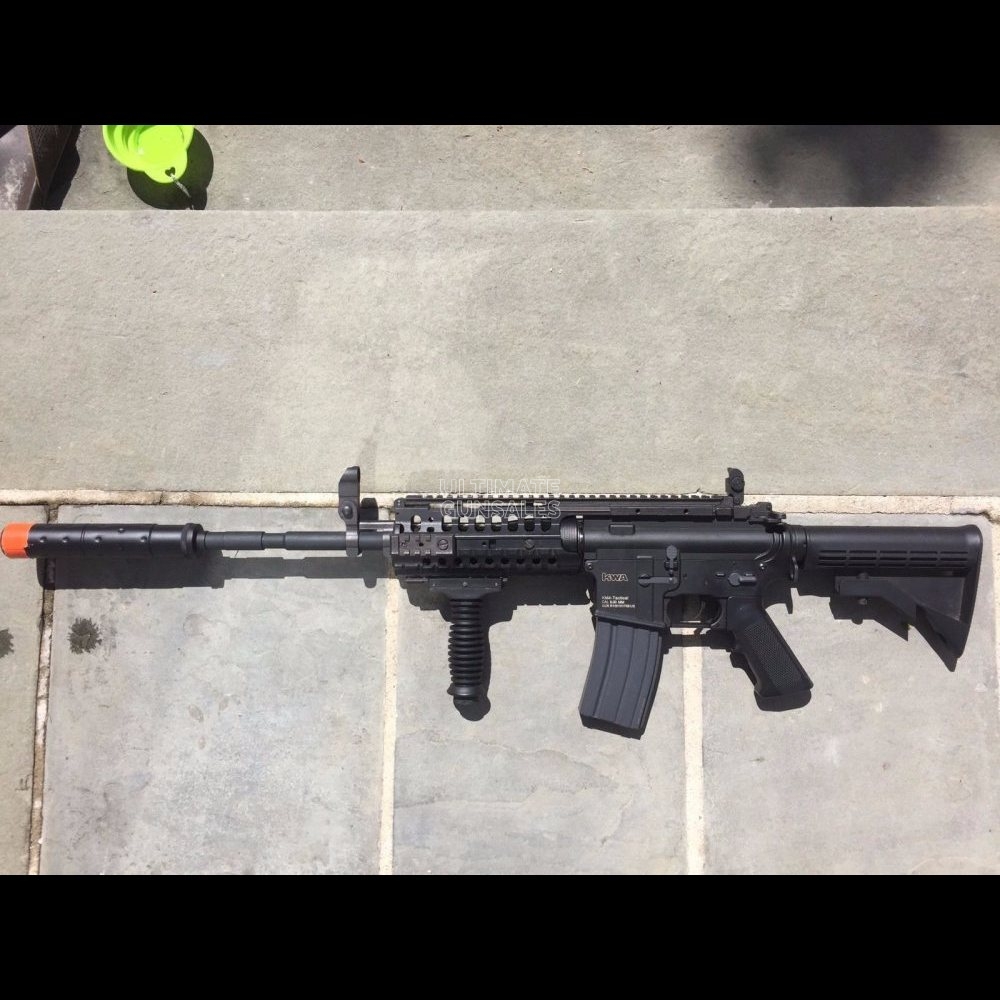 Includes 7.4V mAh LiPo battery with smart charger, one extra hi cap mag, and an upgraded KWA KM4S Tactical AEG. The gun has been upgraded with an m130 spring and a 6.01mm m16 length barrel for added accuracy. In other words, it shoots super far and very h