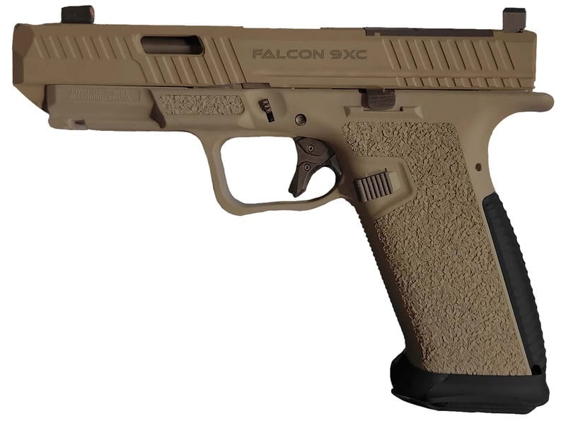 Designed for versatility, the Falcon 9XC features an optic-cut, serrated slide for easy customization. The polymer frame includes a beavertail and Picatinny rail, supporting accessory attachment. The Tritium night sights enhance low-light targeting, while the black aluminum backstrap and a 5.80 lb trigger pull ensure consistent, controlled shooting.