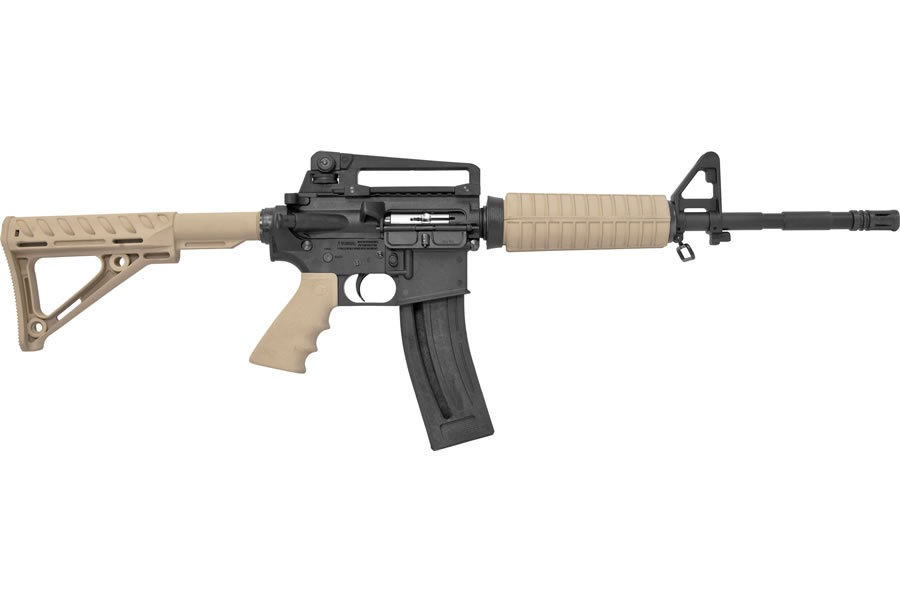 The Chiappa Firearms m four-22 Tan Carbine is a rimfire replica of the versatile weapon system with proven combat utility and performance providing the operator with the confidence required to accomplish any mission. Featuring a 16 in. barrel, it is designed for use wherever lightness, speed of action, mobility and affordable plinking are required. It can be comfortably carried, yet be instantly available to provide affordable, accuracy hours of fun on the range.