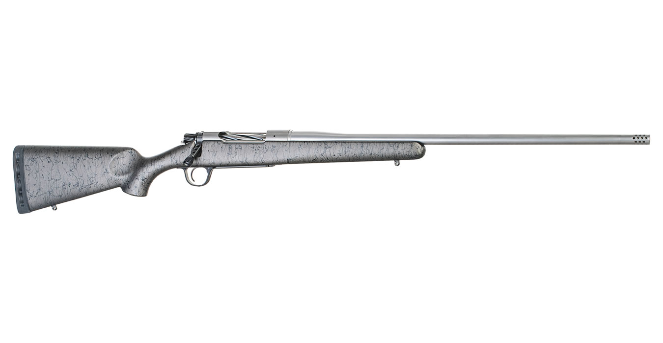 Stock: Christensen Arms Carbon Fiber Composite; Sporter Style; Gray Metallic with BLack Webbing