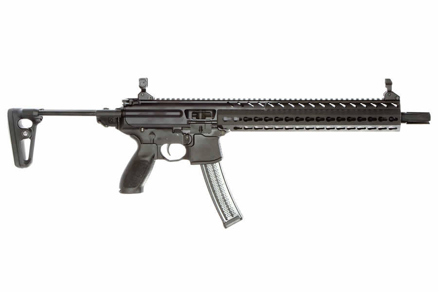 The Sig Sauer MPX Carbine combines all of the features from the original MPX into an all new rifle format. This brand new carbine from Sig Sauer includes a KeyMod Rail System, flip-up sights, a muzzle brake, and a collapsible stock.