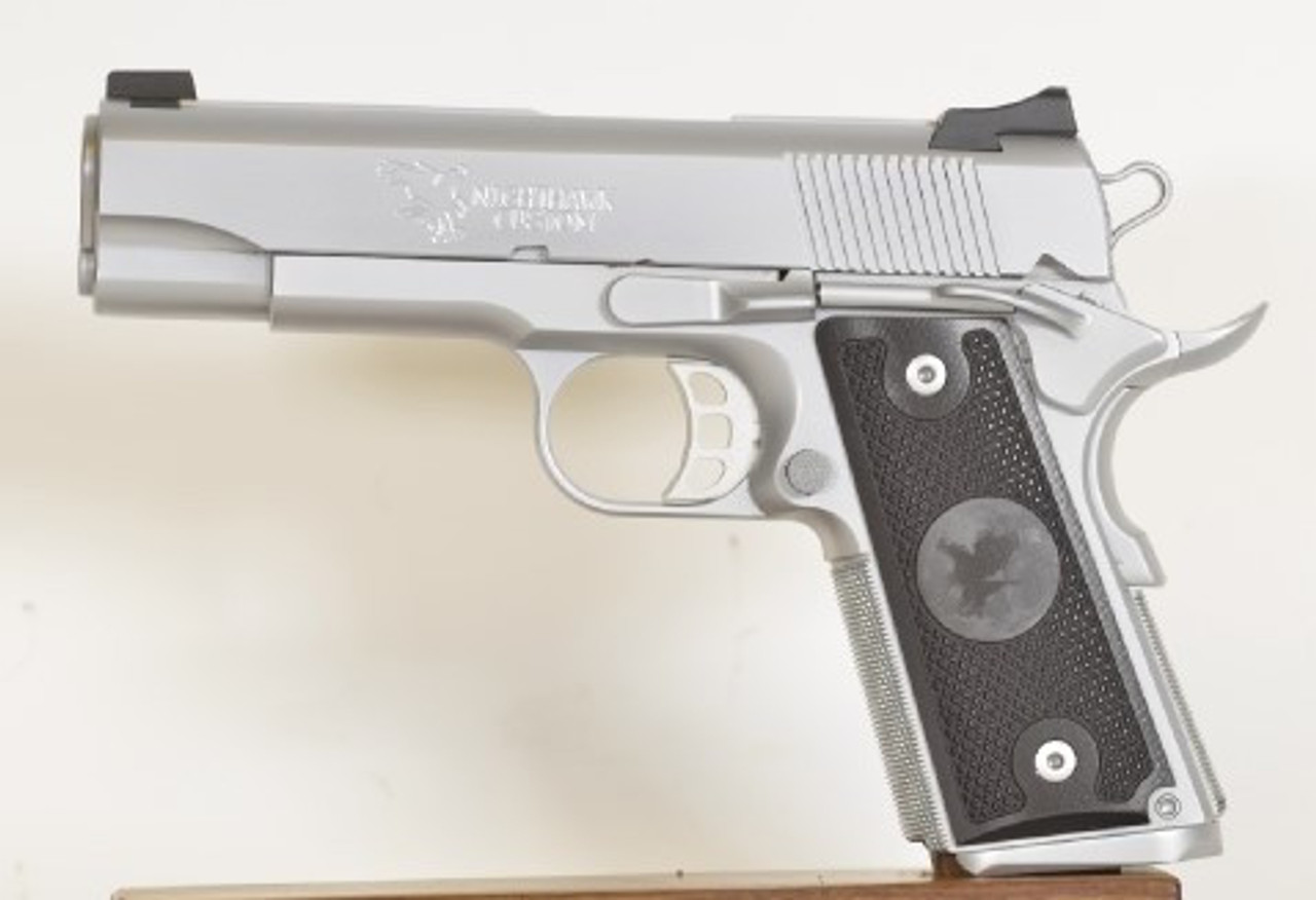 Heinie Slant-Pro Straight Eights Night Sights are standard. The mainspring housing, as well as the rear of the slide, are horizontally serrated to match. This feature also helps prevent snags on silk lined jackets and coats that checkering often causes. The top of the slide is also serrated to reduce glare. A Nighthawk Custom© lightweight aluminum trigger that has been blacked-out using Cerakote™ breaks between 3.5 and 4 lbs with no creep. When you put all of these features in one package, you come up with the finest carry gun you can own. All you add is practice.