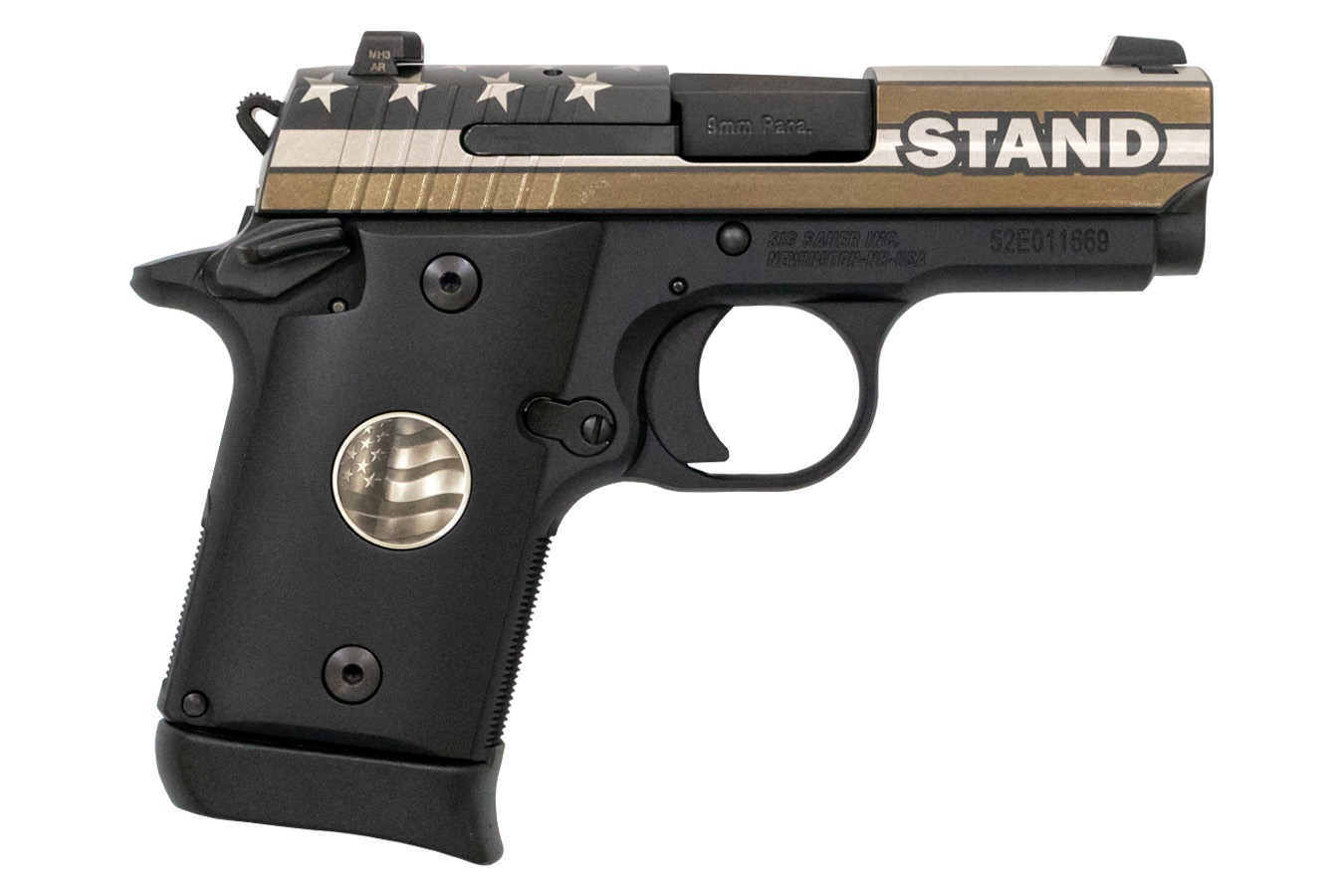 STAND AND SUPPORT: Introducing the special edition P938 STAND. Show your unwavering support for the flag and for America’s National Anthem with this special commemorative edition. With its stars and stripes engraved slide and custom grips with embedded flag medallion, you’ll proudly share in our support for America’s troops and first responders.