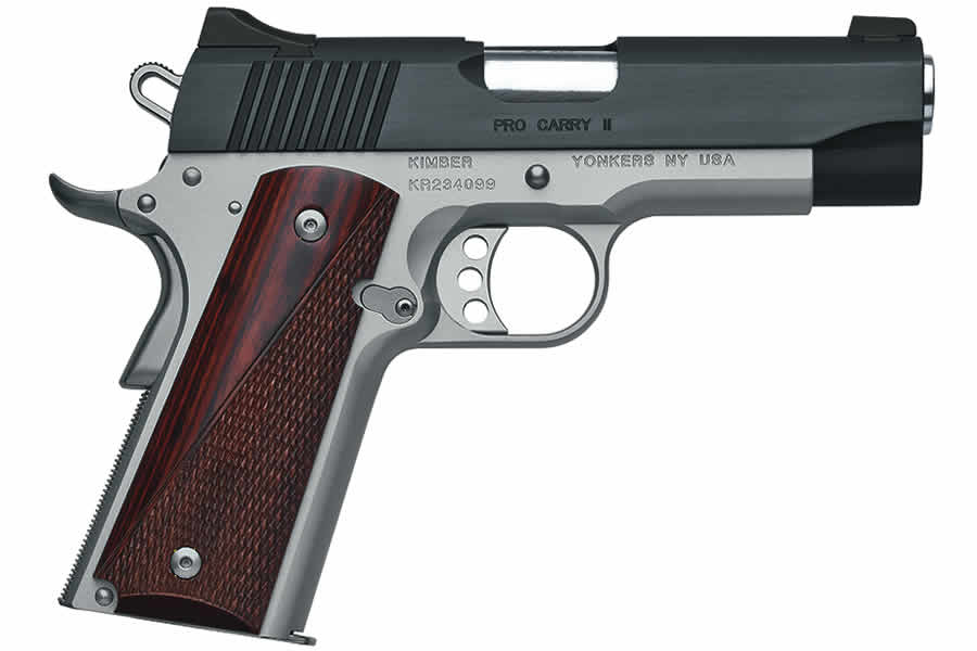 GETTING BACK TO BASICS has never looked so good. The Kimber Pro Carry II Two-Tone has no-nonsense features that promote intuitive operation and absolute dependability, including lowered and flared ejection ports, machined dovetail mounted sights and edges that are rounded and blended for comfortable carry. The classic two-tone slide and frame finish is accented by rosewood grips. This Kimber 1911 is a perfect choice for concealed carry or personal defense.