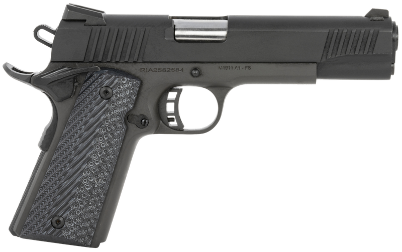 The Rock Island M1911-A1 Standard FS is built with a 5″ barrel supported by a full length guide rod. Smooth, angled, snag-free style allows for quick draw in fast need situations. The M1911-A1 Standard FS includes a Fixed Dovetail rear sight along with skeletonized hammer and trigger with adjustable over travel stop and ambidextrous safety. This Rock Island Armory pistol is finished with a tough, parkerzied matte coating and comes with G10 grips.