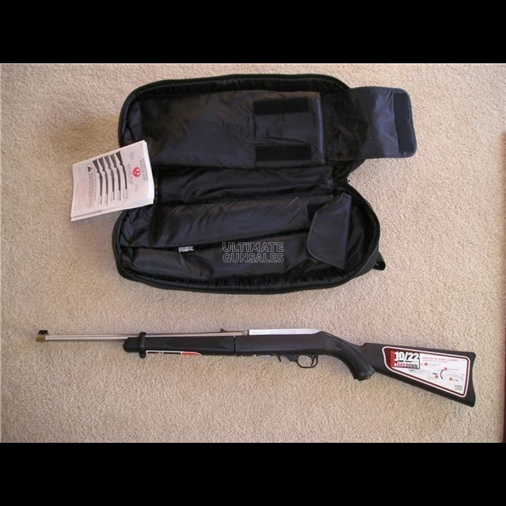 COMES WITH THE BROWN CORDA TAKEDOWN CASE Description: RUG 10/22-TD 22LR SS BLK SYN Brand: Ruger Model: 10/22 Take Down Type: Rifle: Semi-Auto Caliber: 22LR Finish: Polished Stainless Steel Barrel Action: Semi-Automatic Stock: Black Synthetic Sight: Front: Gold Bead Rear: Folding Leaf Barrel Length: 18.5 Overall Length: 37 Weight: 4.67 lbs Capacity: 10+1 # of Mags: 1 Safety: Cross Bolt Safety Receiver: Drilled & Tapped Features: Scope Base Adapter, Detachable Rotary Magazine; Rifling: 1-16 RH, Brown Cordura Takedown Case
