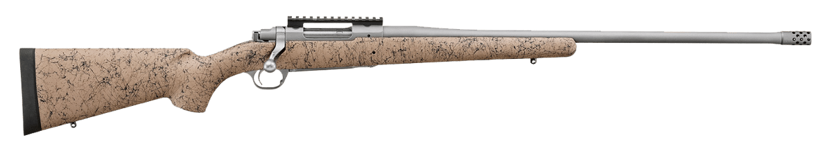 The Ruger Hawkeye FTW Hunter features a non-rotating, Mauser-type controlled round feed extractor; hinged, solid-steel floorplate; engraved FTW Hunter logo; patented latch that is flush with the trigger guard to avoid accidental dumping of cartridges; 20 MOA Picatinny rail secured with four, #8-40 screws; three-position safety; Pro-Series H-S Precision tan-black speckled synthetic stock features a full-length aluminum bedding block and slender pistol grip with Pro-Center technology; LC6 trigger; cold hammer-forged barrel; Ruger Muzzle Brake System includes a removable, radial-port muzzle brake that significantly reduces felt recoil. Includes thread protector and studs for mounting sling swivels.