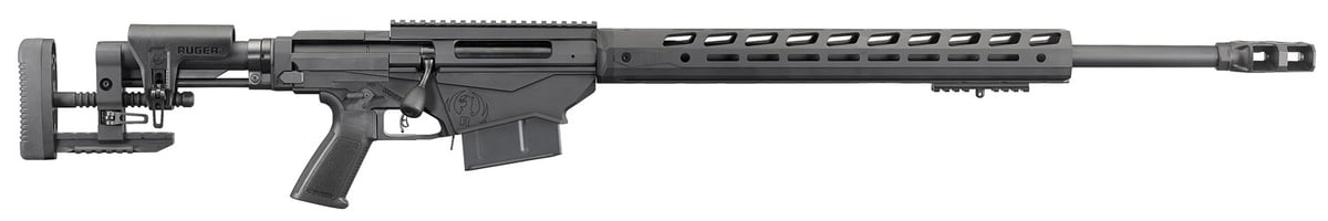 Ruger’s Precision Rifle features an in-line recoil path which manages recoil directly from the rear of the receiver to the buttstock, providing maximum accuracy potential. The Ruger Precision MSR stock comes with QD sling attachment points and features a bottom Picatinny rail and soft rubber buttpad. Its left-folding stock hinge is attached to an AR-style buffer tube and accepts any AR-style stock. The length of pull and comb height are adjustable. Its 18″ free-float M-Lok handguard is made of aluminum and features M-Lok slots on all four sides, while the receiver and one-piece bolt are precision CNC-machined from pre-hardened 4140 chrome-moly steel. The 30 MOA Picatinny rail is ideal for increased long-range elevation capabilities. The cold hammer-forged chrome-moly steel barrel features 5R Rifling, heavy-contour, and a Ruger Precision Rifle Magnum Muzzle Brake along with an included thread protector. The Precision Rifle also has a Ruger Marksman adjustable trigger, ambidextrous manual safety, magazine well front that is contoured and precision machined from aerospace-grade 7075-T6 aluminum, and patented multi-magazine interface functions.