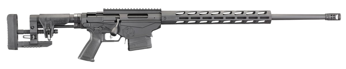 Ruger’s Precision Rifle features an in-line recoil path which manages recoil directly from the rear of the receiver to the buttstock, providing maximum accuracy potential. The Ruger Precision MSR stock comes with QD sling attachment points and features a bottom Picatinny rail and soft rubber buttpad. Its left-folding stock hinge is attached to an AR-style buffer tube and accepts any AR-style stock. The length of pull and comb height are adjustable. Its 18″ free-float M-Lok handguard is made of aluminum and features M-Lok slots on all four sides, while the receiver and one-piece bolt are precision CNC-machined from pre-hardened 4140 chrome-moly steel. The 30 MOA Picatinny rail is ideal for increased long-range elevation capabilities. The cold hammer-forged chrome-moly steel barrel features 5R Rifling, medium-contour, and a Ruger Precision Rifle Hybrid Muzzle Brake along with an included thread protector. The Precision Rifle also has a Ruger Marksman adjustable trigger, ambidextrous manual safety, magazine well front that is contoured and precision machined from aerospace-grade 7075-T6 aluminum, and patented multi-magazine interface functions.
