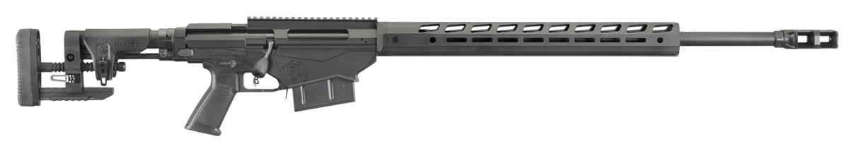 Ruger’s Precision Rifle features an in-line recoil path which manages recoil directly from the rear of the receiver to the buttstock, providing maximum accuracy potential. The Ruger Precision MSR stock comes with QD sling attachment points and features a bottom Picatinny rail and soft rubber buttpad. Its left-folding stock hinge is attached to an AR-style buffer tube and accepts any AR-style stock. The length of pull and comb height are adjustable. Its 18″ free-float M-Lok handguard is made of aluminum and features M-Lok slots on all four sides, while the receiver and one-piece bolt are precision CNC-machined from pre-hardened 4140 chrome-moly steel. The 30 MOA Picatinny rail is ideal for increased long-range elevation capabilities. The cold hammer-forged chrome-moly steel barrel features 5R Rifling, medium-contour, and a Ruger Precision Rifle Hybrid Muzzle Brake along with an included thread protector. The Precision Rifle also has a Ruger Marksman adjustable trigger, ambidextrous manual safety, magazine well front that is contoured and precision machined from aerospace-grade 7075-T6 aluminum, and patented multi-magazine interface functions.