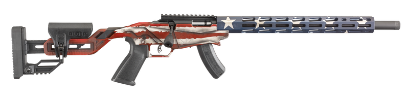 The Ruger Precision Rimfire with finished with in the American Flag Cerakote has a molded, one piece chassis and adjustable buttstock assembly with glass filled nylon for strength, stiffness and stability making a solid foundation for accuracy. The buttstock features a flat Picatinny bag rider making it easy to affix a rear monopod. A metal QD pocket to secure a sling. The Quick-Fit adjustable Precision Rimfire stock allows length of pull and comb height to be quickly and easily adjusted to get proper fit over a wide range of shooter sizes and positions. Indicating marks molded into the chassis help you quickly return to a previous position. Big-Gun bolt throw adjustment enables shooters to change from a rimfire 1-1/2″ bolt throw to a short-action centerfire 3″ bolt throw, oversized bolt handle for positive bolt manipulation. The Ruger Marksman Adjustable trigger is externally adjustable, with a trigger pull range of 2.25 to 5 pounds; wrench is stored in a buttstock compartment. Ruger’s AR-Pattern pistol grip and safety selector provides an extended reach for maximum control and access to the 45 degree reversible safety selector. Anodized Picatinny scope base includes 30 MOA elevation for increased long-range capabilities. The 15″ aluminum free-float handguard features Magpul M-LOK slots on all four sides for improved scope clearance for long-range scopes and easy mounting of M-LOK-compatible rails and accessories. Target barrel is cold hammer-forged from 1137 alloy steel, 1/2″-28 threaded for standard muzzle accessories, comes with a factory-installed thread protector covering both the threads and crown. The Precision Rimfire accepts all 10/22 magazines.