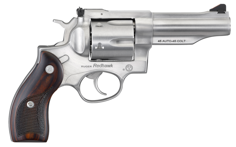 The Ruger Redhawk is chambered to shoot both 45 Auto and 45 Colt cartridges. The rugged stainless steel construction with no side plates, is designed specifically to handle powerful magnum loads through extra metal in top strap, sidewalls and barrel mounting, while the cold hammer-forged sleeve and shroud barrel provides outstanding accuracy.