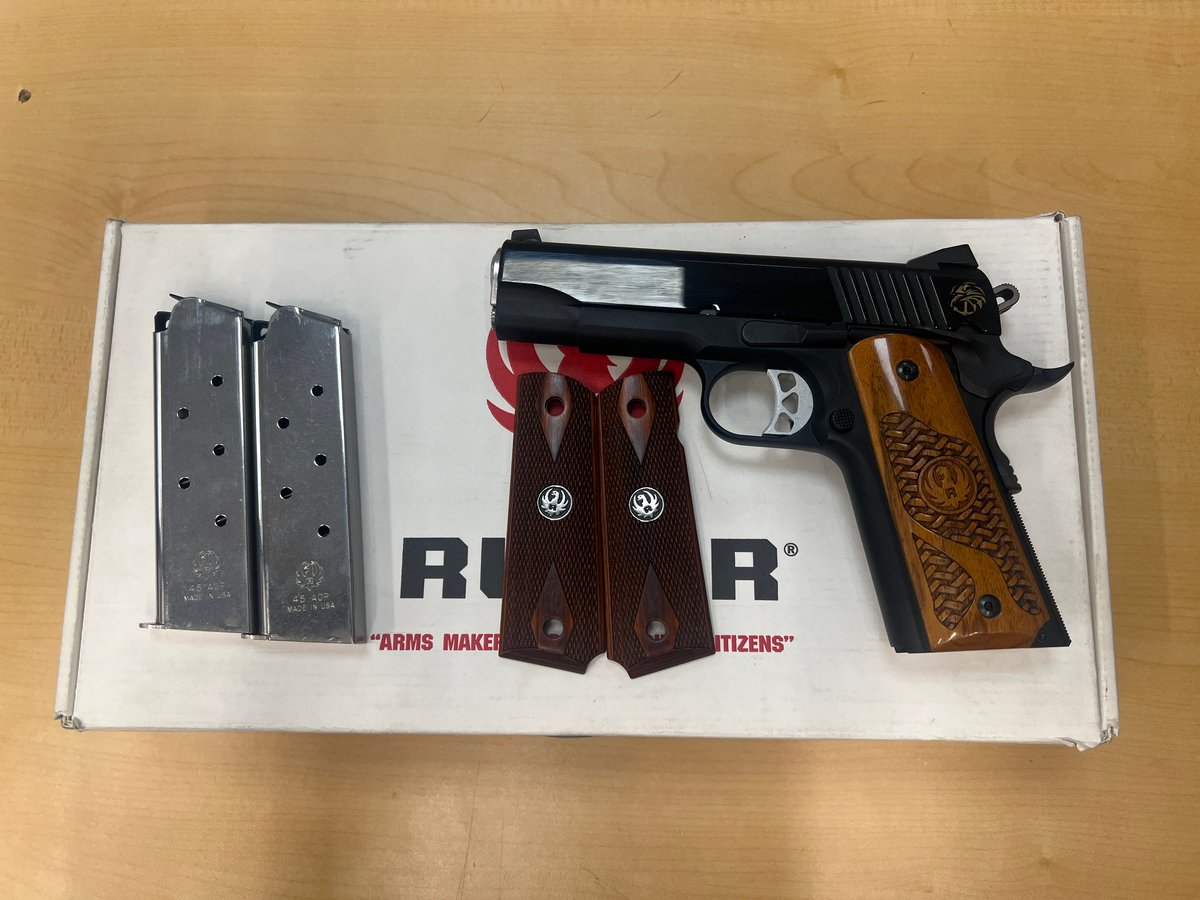 This compact 1911 has a 4in barrel with two 7rd magazines. It is number 414/500 and comes with two sets of grips. Original box included.