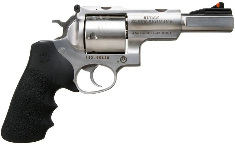The Ruger Super Redhawk triple-locking cylinder is locked into the frame at the front, rear and bottom for more positive alignment and dependable operation shot after shot. Durable, corrosion-resistant stainless steel construction. The Super Redhawk has strong, extended frame with extra metal in the top strap, sidewalls and barrel mounting areas to handle powerful, big game loads. Hogue Tamer Monogrip with an internal recoil cushion positioned under the web of the hand helps reduce the impact of powerful loads, while the peg-style grip frame easily accommodates custom grips. Dual chambering allows the .44 Magnum models to accept factory .44 Special cartridges and the .454 Casull models to accept factory .45 Colt cartridges.