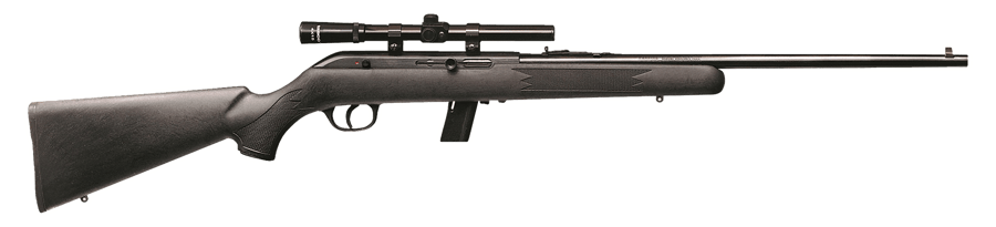 The Savage Arms 64 is a semi-automatic straight-blowback action rifle chambered in 22 LR. It features a matte black synthetic stock blued satin finish free-floating carbon steel barrel open sights and detachable box magazine. This rifle is available in a true left-handed version and is also available drilled and tapped for scope mounts.