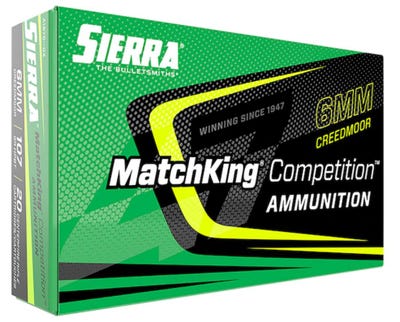 Sierra MatchKing Competition Ammunition is an excellent choice for competitive and recreational shooting applications. Each box contains 20 rounds of 6mm Creedmoor ammo loaded with 107 grain MatchKing projectiles and brass casings. Get the best match ammo for sale online from GrabAGun today!Sierra MatchKing Competition Ammunition Features Sierra loads its MatchKing Competition Centerfire Rifle Ammunition with the best components made, and holds their manufacturing processes to exact tolerances to deliver the kind of extreme accuracy necessary for winning competitions. MatchKing Competition ammunition uses Sierra MatchKing hollow point boat tail bullets, acclaimed by world-class shooters as well as law enforcement and military professionals. MatchKing bullets have thin jackets and are exceedingly consistent in diameter and weight, and have small meplats to produce high ballistic coefficients. Sierra MatchKing Competition Ammo delivers pinpoint accuracy, and is some of the best factory produced ammunition for long range shooting available. This ammunition is new production, non-corrosive, in boxer primed, reloadable brass cases. Sierra MatchKing Competition Ammunition Specifications Cartridge: 6mm Creedmoor Grain Weight: 107 Grains Quantity: 20 Round Muzzle Velocity: 3000 Feet Per Second Muzzle Energy: 1264 Foot Pounds Bullet Style: HPBT Bullet Brand And Model: Sierra MatchKing Lead Free: No Case Type: Brass Primer: Boxer Corrosive: No Reloadable: Yes G1 Ballistic Coefficient: 0.572 Sectional Density: 0.259