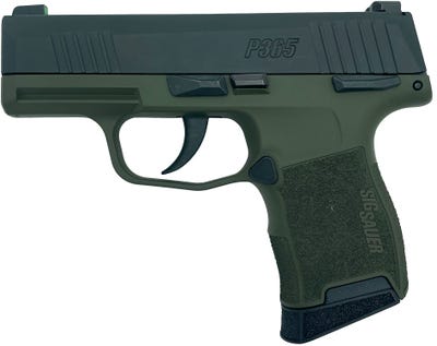 The P365 is striker-fired, with the clean crisp trigger pull you expect from a SIG. Lightweight and easy to conceal, the P365 is chambered in 9mm with a 3.1 inch barrel and is rated for +P ammunition. Included standard are XRAY3 Day/Night sights and two 10 round magazines. This model features an exclusive green coated frame, black slide, and manual safety. Get the best handguns and gun deals online from GrabAGun today!P365 Green / Black GrabAGun Exclusive Features Sig’s pistols are engineered to perform anywhere, at any time, and under any circumstance. They boast unique, advanced features that stand out among the rest. The P365 micro-compact pistol is a revolutionary concealed carry pistol that gives you more capacity, concealability and capability. It is striker-fired, with a stainless steel slide, and has a polymer grip. The proprietary magazine design allows for a 10 round capacity in both the flush fit and extended grip sizes. The P365 is rated for +P ammunition and comes with X-Ray3 day/night sights. P365 Green / Black GrabAGun Exclusive Specifications Brand: Sig Sauer Category: Pistols Caliber: 9mm Luger Model: P365 Action: Striker Fired Safety: Manual Finish: Green / Black (GrabAGun Exclusive) Capacity: 10 plus 1 Frame Material: Polymer Sight Configuration: X-Ray3 Weight: 17.80 oz Barrel Length: 3.1″