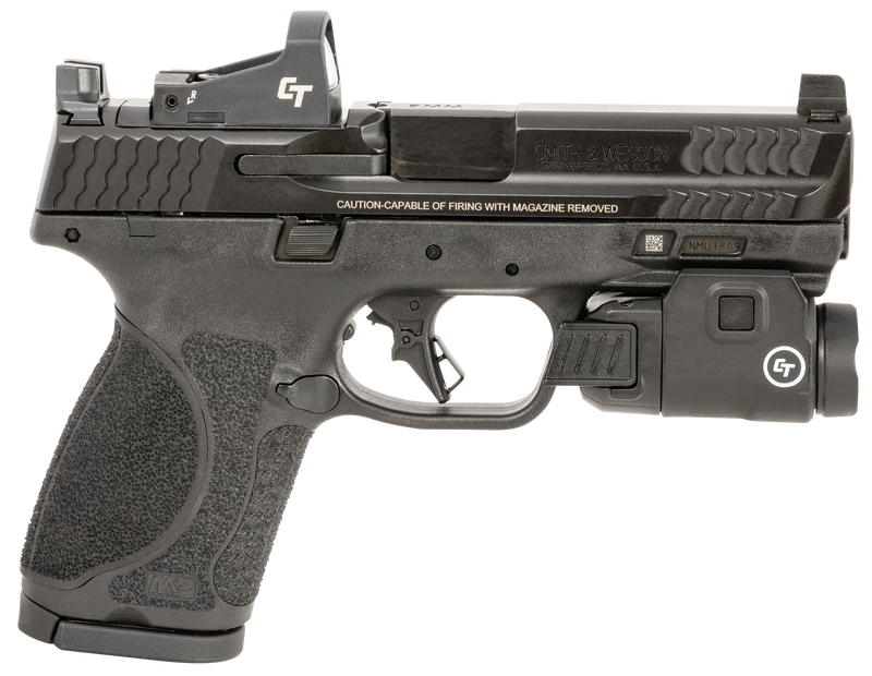 The Smith & Wesson M&P 2.0 aare chambered in 9mm with a 4″ barrel, feature a slide cut for optics, co-witness white-dot front and rear sights, and enlarged forward serrations. Highlights of the M&P M2.0 pistol include an extended stainless-steel chassis and a low barrel bore axis for reduced muzzle rise and faster aim recovery; flat-face trigger, lighter pull and a tactile and audible reset. The Rail Master features an On/Off features, 200 lumen output, weighs 2 oz and 1 1/2 hr run time. Includes battery and two magazines.